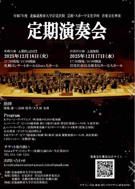 岩見沢市民会館まなみーる大ホールと札幌コンサートホールKitara大ホールにて、教育大学岩見沢校の定期演奏会を開催します。吹奏楽、合唱、弦楽アンサンブル、オーケストラ、協奏曲と多様な形態を1度に聞ける演奏会となっております。協奏曲のソリストはオーディションにて選ばれた2名(ピッコロ、ピアノ)となっております。音楽文化専攻全員が力を合わせて頑張っていますので、是非お越しください!